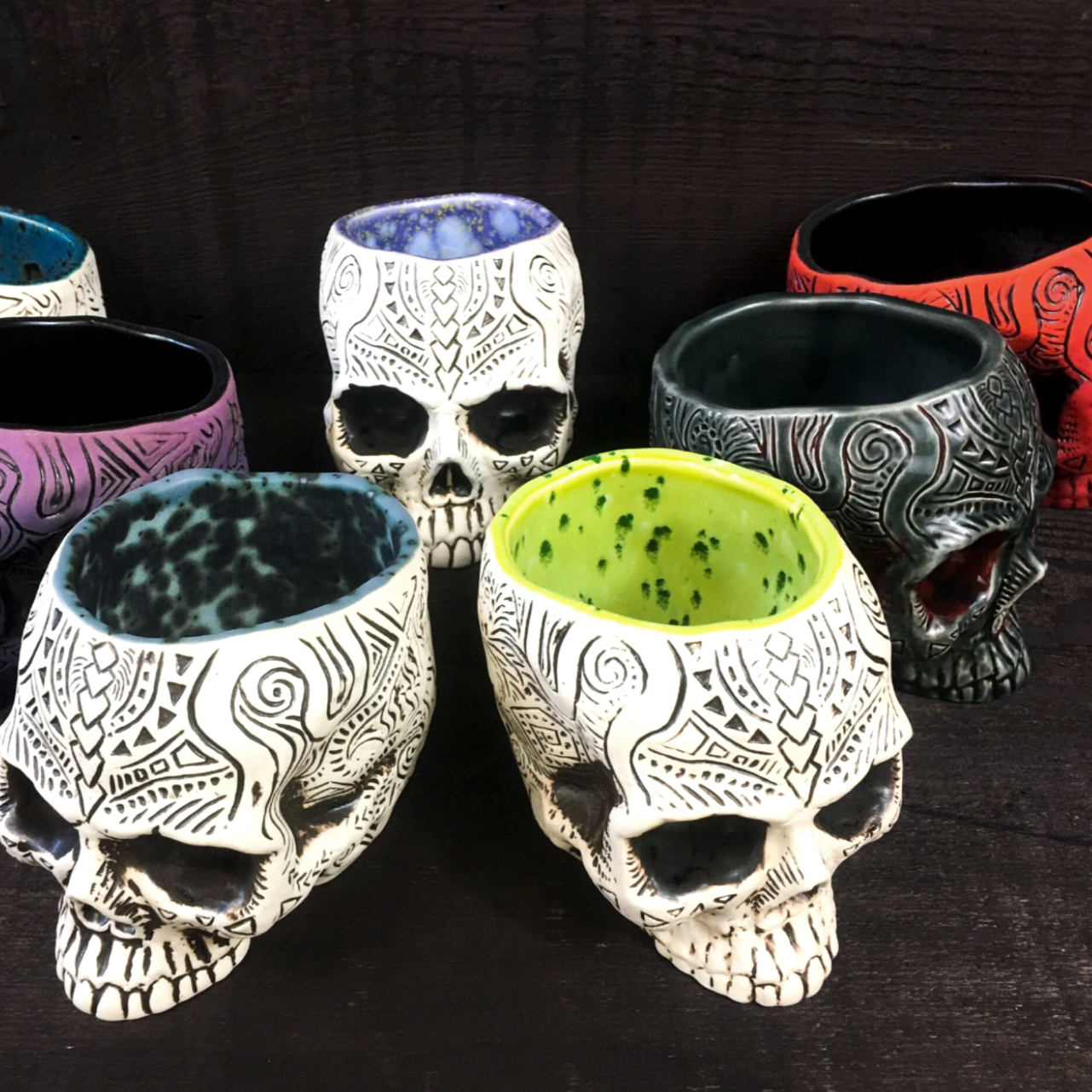 Rooted in the tiki mug tradition but drawn toward darker mythology — Japanese demons, Lovecraftian horrors, skull forms, and things that don't have names yet — these are objects made to be collected.